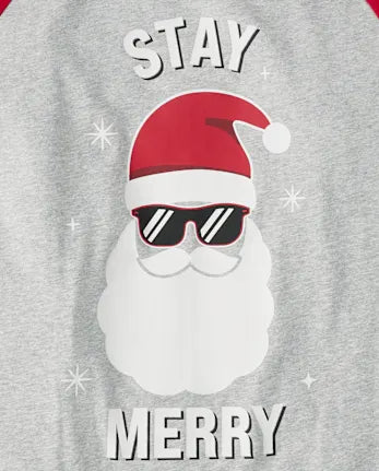 - PAJAMA TOP: Crew neck, long contrast raglan sleeves with banded cuffs, glow-in-the-dark 'Stay Merry' with Santa in sunglasses graphic design