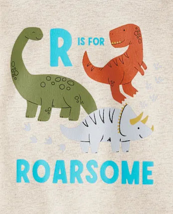 - PAJAMA TOP: Contrast crew neck, long sleeves with banded cuffs, 'R Is For Roarsome' with dino graphic design