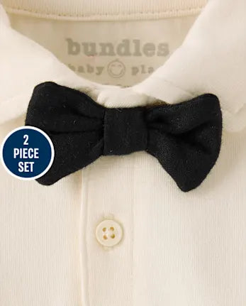 - FABRICATION: 94% cotton/6% spandex jersey bodysuit, 86% polyester/12% rayon/2% spandex jacquard pants, 100% cotton interlock bow tie, imported