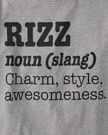 - FEATURES: 'Rizz: charm, style, awesomeness' definition graphic design, tagless label