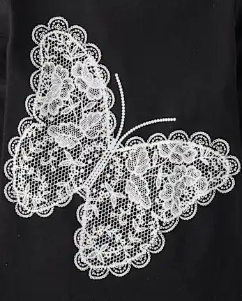 - FEATURES: Lace butterfly graphic design at front and sleeve, tagless label