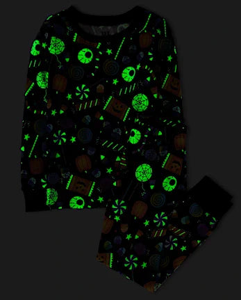- FEATURES: Glow-in-the-dark Halloween candy print; for best glow effect, expose to light before wearing