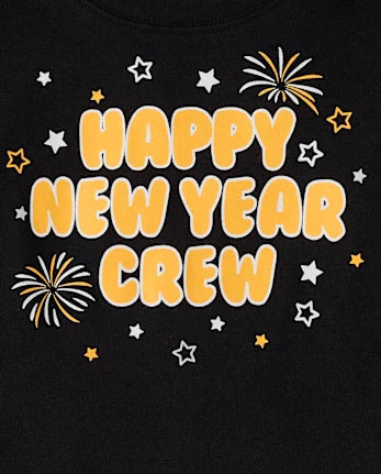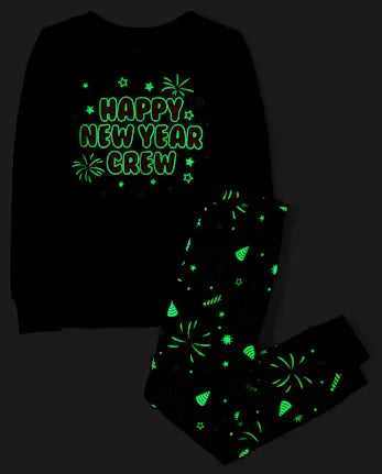 - PAJAMA TOP: Rib-knit crew neck, long sleeves with rib-knit banded cuffs, glow-in-the-dark 'Happy New Year Crew' with fireworks graphic design