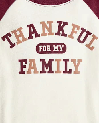 - PAJAMA TOP: Crew neck, long contrast raglan sleeves, 'Thankful For My Family' graphic design